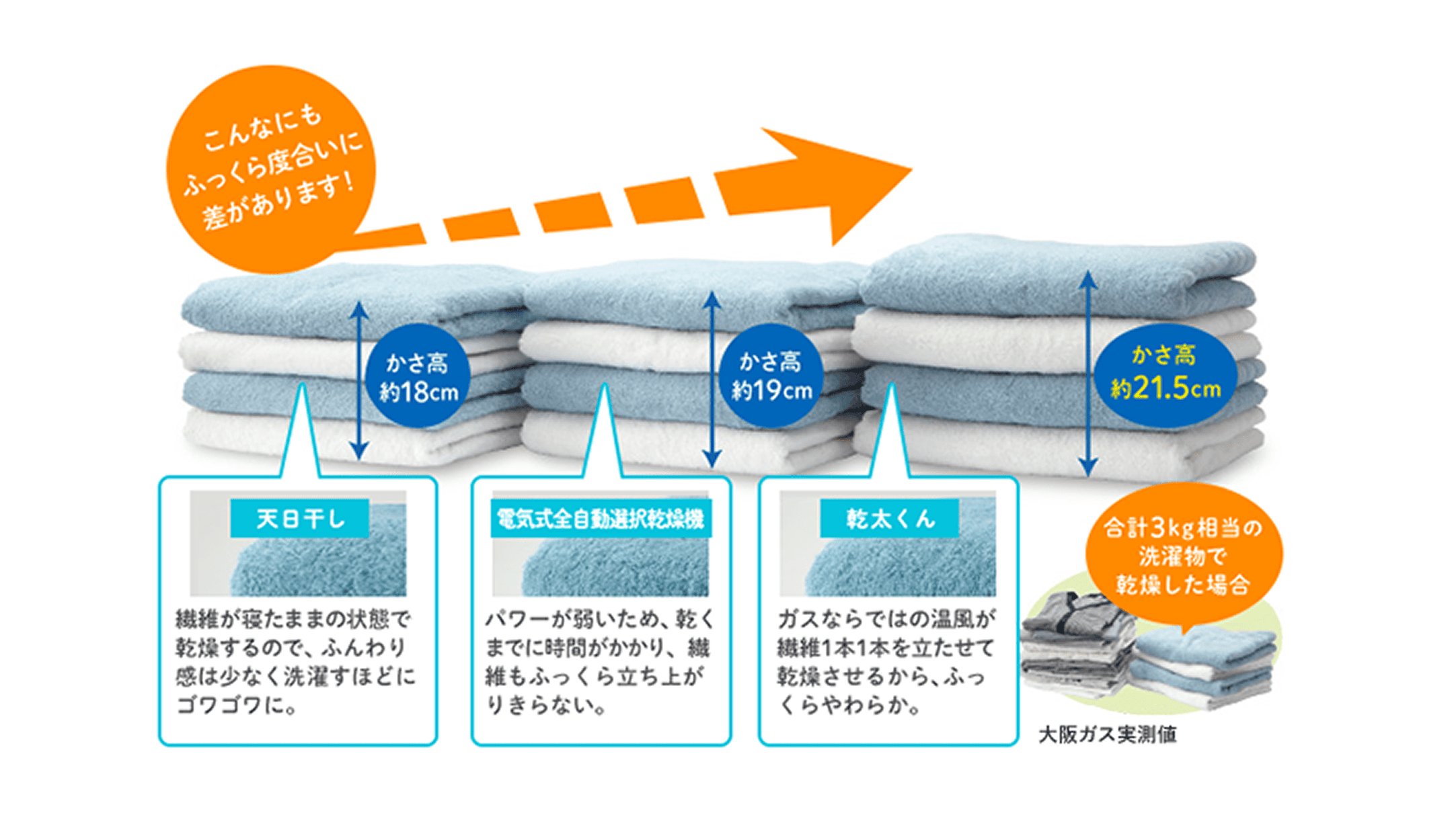 大容量ドラム×ガス温風でしっかり乾かしながら、洗濯ものの繊維の一本一本を根元から立ち上げます。繊維が寝たままになりがちな天日干しとは、仕上がりに雲泥の差が出ます。