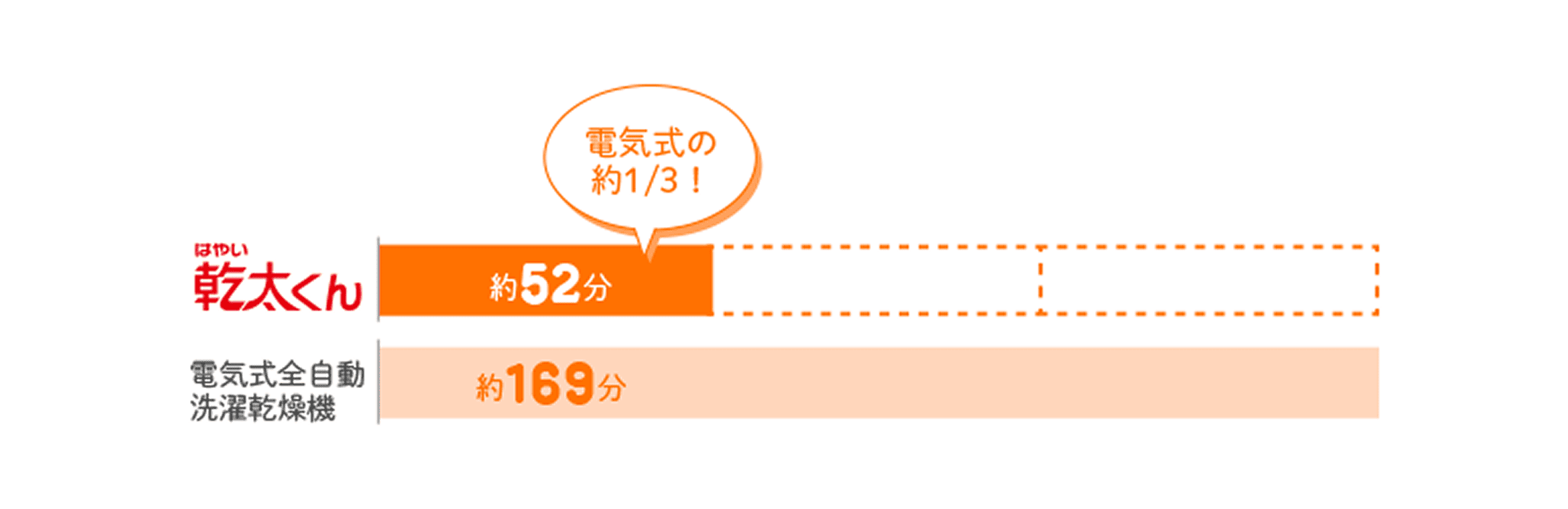 「乾太くん」と「全自動洗濯乾燥機」の乾燥時間の比較イメージ